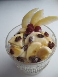 яблоко, банан, изюм, йогурт или сметана с сахаром.
