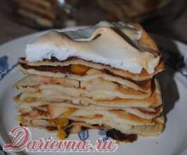 А мы предлагаем вам еще один вариант - блинный торт с яблоками, курагой, корицей и нежной меренгой.