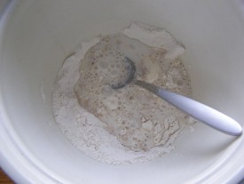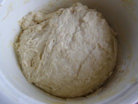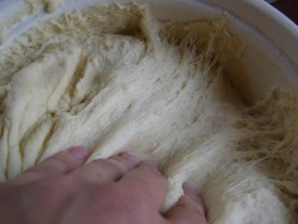 Постепенно вмешиваем муку. Не спешите добавлять все сразу - иногда в зависимости от особенностей местного продукта его может понадобиться значительно меньше, чем указано в рецепте. А иногда - больше. Дрожжевое тесто любит ласку - чем дольше вы его вымешиваете, тем большую отдачу получите в итоге. После 5,5 стаканов остановитесь и минут 5-10 просто вымешивайте тесто. Да, вымешивать - это не значит постоянно добавлять муку. Это просто означает, что вы медленно, ласково, с душой перемешиваете то, что уже есть в миске. Если вы почувствуете, что этого достаточно, смело заканчивайте - думаю, вы не ошибетесь. Если не уверены, добавьте еще полстакана. Тесто продолжает сильно прилипать к рукам? Оно кажется вам жидким и недовымешанным? Добавьте еще немного муки и вымешивайте минут 5-7.