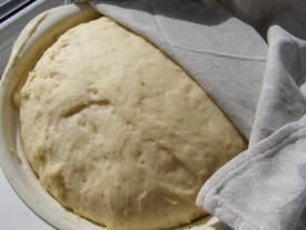 Накрыв тесто чистым полотенцем, ставьте его в теплое место. Если погода мрачная, и подоконник (как у меня) вас не спасет, поставьте тесто на табуретку возле батареи. Если отопление еще не включено, можно набрать горячей воды в раковину и поместить туда миску с тестом.