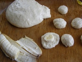 Сбив тесто, начните формировать булочки. Я на стол наливаю немного растительного масла, выкладываю все тесто, отрываю необходимые мне кусочки, из которых формирую булочки. Способов сворачивания очень много (когда-нибудь я обязательно покажу вам, как умею сама), я в этот раз делала самые простые, потому что вовнутрь каждой булочки мне хотелось спрятать по кусочку банана - просто чтобы усилить аромат и добавить немного "изюмистости".