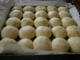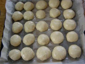 Выкладывайте булочки на противень, смазанный маслом либо застеленный бумагой для выпекания.