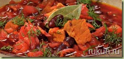Добавить фасоль вместе с отваром, вновь довести до кипения и варить 5 мин. Перед подачей мясо нарезать кусочками, разложить по тарелкам и залить борщом.