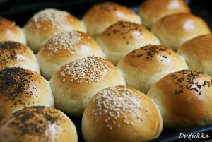 Яйцо хорошо размешиваем в 2 ст.л. воды. Подошедшие булочки смазываем яйцом и сразу же посыпаем маком или кунжутом по желанию. Выпекаем примерно 15-20 минут до золотистого цвета. Накрываем полотенцем и остужаем.