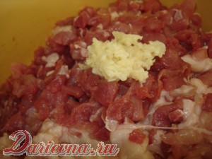 Добавить чеснок, пропущенный через чеснокодавку, соль, перец по вкусу и 100-120 мл холодной кипяченой воды. Моя бабушка, когда делала такую колбасу, обязательно добавляла несколько измельченных практически в порошок, предварительно подсушенных лавровых листиков.