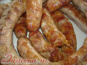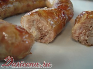 Я предпочитаю первый вариант. Но если такой возможности у вас нет, включайте духовку до 160-170 градусов, укладывайте колбасу на противень и запекайте минут 30 с одной стороны, переверните и примерно столько же времени запекайте с другой. Готовность можно проверить следующим образом: проткнуть колбасу ножом – если сок вытекает прозрачный, все готово!