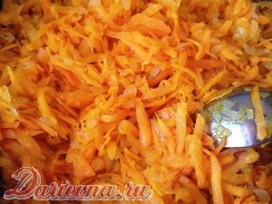 Рис помыть, залить кипятком и накрыть крышкой – пусть пропаривается. Овощи очистить. Морковку натереть на крупной терке. Лук порезать небольшими кубиками. Пассеровать на растительном масле лук до золотистого цвета, после чего добавить морковь и немного обжарить.