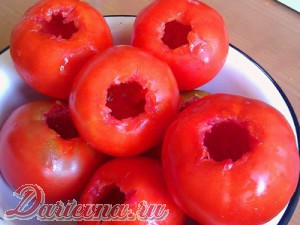 Ножом у помидор вырезать место хвостика и чайной ложкой выбрать внутреннюю мякоть, не трогая стенки, только перегородки (можно помогать ножом).