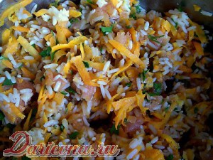 Мясо измельчить на мясорубке (комбайне, блендере). Петрушку мелко порезать. Слить воду с риса. Выложить к нему морковь и лук, зелень, сливочное масло и фарш. Посолить, добавить любимые приправы (перец, кари, паприка, кориандр, хмели-сунели). Все тщательно перемешать.