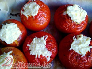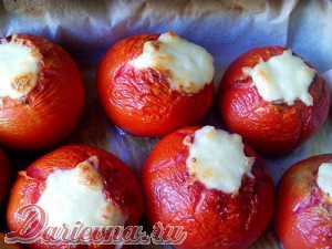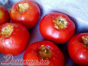 Готовой смесью наполнить помидоры, практически до верха, уложить на противень, застланный пекарской бумагой. Отправить в разогретую до 200 градусов духовку на 20-30 минут.