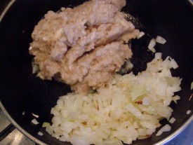 Ножки измельчили блендером. Если вам хочется чувствовать не однородную пастообразную массу, а яркие бугорочки шампиньонов, можете просто мелко нарезать грибы. Измельченную заготовку переместили к обжаренному луку, добавили соль, перец, специи.