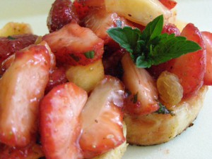 Салат - моем клубнику, разрезаем ее на красивые кусочки, чистим и нарезаем персик (банан, яблоко, киви, смородину, малину...). В чашке хорошо размешиваем нарезанную на мелкие кусочки мяту с сахарной пудрой - мята должна отдать свои масла, а пудра раствориться. Туда же - сок лимона и корицу. Заливаем этой заправкой салат, несколько раз встряхиваем миску (хорошо, если клубника немного пустит сок - так и должно быть!).