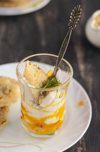 Нужно сварить яйцо "в мешочек", так чтобы белок был твердым, а желток жидким, варить нужно 4 минуты. Затем аккуратно очистить яйцо и ложкой, аккуратно выложить его в стакан. На дно можно положить нарезанные кусочками любимые овощи. У меня здесь сельдерей и красный перец. При подаче посыпать зеленью.