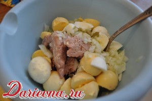 Смешиваем желтки, лук, печень трески (без масла). Добавляем при необходимости соль и перец. Если требуется, доливаем немного масла, чтобы начинка не была сухой.