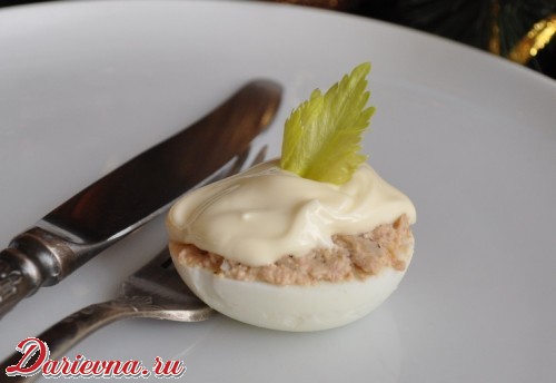 Один из отличных вариантов праздничной закуски. Легко, просто, не отнимает много времени - идеальный вариант для любой хозяйки. А еще фаршированные яйца замечательно подходят для пикников: приготовив дома, вы можете захватить их с собой, а при подаче на стол... вернее, на то, что в лесу заменит вам стол, смазать майонезом.
