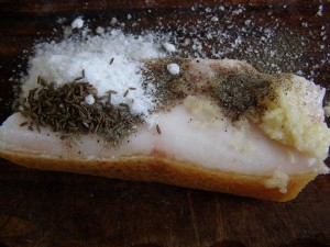 И всем этим богатством хорошо обмазываем сало. Пропорций нет и быть не может - все делается на глаз, а "умный" продукт сам возьмет все, что ему нужно. Особенно это касается соли - я просто засыпаю ею сало, следя за тем, чтобы со всех сторон она создала по возможности "корочку". Лишнее потом счищается - нужное впитывается.