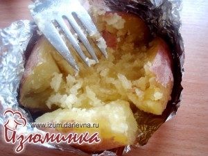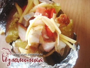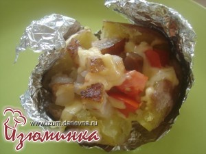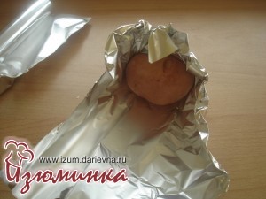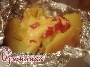 Обращаю ваше внимание, что фольгу не надо убирать с картофеля, а следует лишь развернуть, освободив верхнюю часть. Низ же картошки должен оставаться в фольге. Делаем на картошке крестообразный надрез, не очень глубокий, примерно на 1\3 часть высоты клубня.