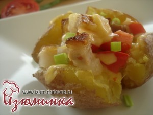 Присаливаем картошку и выкладываем на 2тарелочку" начинку. старайтесь сделать это аккуратно, чтобы начинка не свисала с картошки, а оставалась посредине.