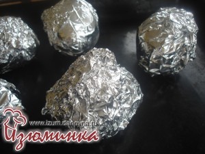 Следующий этап - запекание картошки в духовке целиком. Для этого нам понадобится пищевая фольга. Отрезаем подходящий по размеру кусок фольги и заворачиваем в нее картошку. Каждый клубень заворачиваем отдельно, хорошенько запечатывая края фольги.
