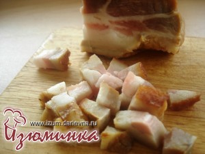 А пока картошка у нас находится в духовке, займемся начинкой. основной ингредиент для нее - это копченая грудинка. Я настаиваю именно на грудинке, а не на каком-либо копченом мясе - сало прекрасно сочетается с картофелем. Главное, чтобы копченая грудинка была свежей и хорошего качества. Режем грудинку кубиками небольшого размера, ориентировочно со стороной 0,5-0,7 см.