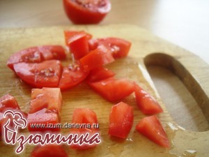 Cледующий на очереди - помидор. Он должен быть обязательно спелый, сочный и ароматный, готовый щедро поделиться своим вкусом. Моем помидор и режем на кусочки, по размеру равные кубикам грудинки. При желании можно удалить с помидора предварительно шкурку. Для этого его нужно обдать кипятком - так кожица снимется легче и быстрее.