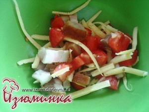 Смешиваем в отдельной емкости сыр, грудинку и помидор. Не надо добавлять к ним ни майонез, ни сметану - сыр потом расплавится и будет связующим звеном для всех ингредиентов начинки.