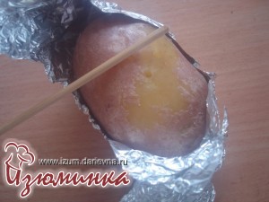 За это время должна уже приготовиться наша картошка. Проверить это можно с помощью деревянной шпажки. Если она легко входит в картофель, то он готов.