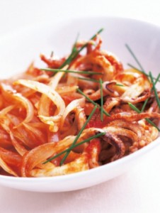 Перемешивайте, пока лук и кальмары не станут золотистого цвета. Влейте томатный соус. Добавьте пряные травы, доведите до кипения и тушите в течение 1,5 часа на очень медленном огне.