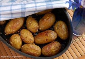 Дома духовку разогреть до 200 гр. Картофель выложить в форму и запекать 25-30 минут. Один раз картофелины перевернуть‚ чтобы равномерно пропеклись.