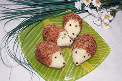 Хлебные обрезки надо высушить в духовке и растолочь, а потом обвалять ежиков в крошках, оставляя свободными мордочки. Поставить в духовку на 7 минут.
