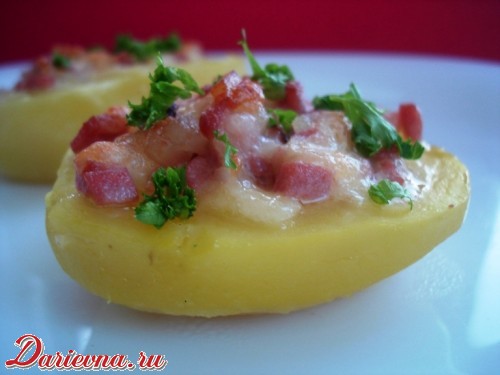 Картофель для этого блюда надо выбирать круглый, одного размера. Картошку очистить, разрезать пополам. Отварить в соленой воде минут 15-17. Вынуть чайной ложкой середину, оставляя стенки толщиной примерно 1 сантиметр.