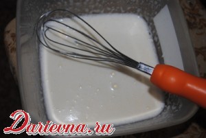 Масло растопить и дать остыть до комнатной температуры. Яйца взбить с сахаром, затем добавить молоко и масло, хорошо перемешать.