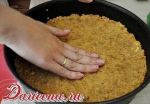 Смешиваем с растопленным сливочным маслом и выкладываем на дно разъемной формы, старательно утрамбовывая пальцами.
