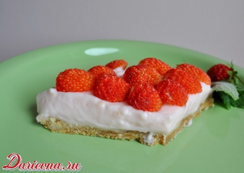 Йогуртовую массу выливаем на печенье. Убираем на час в холодильник, после чего декорируем свежей клубникой.