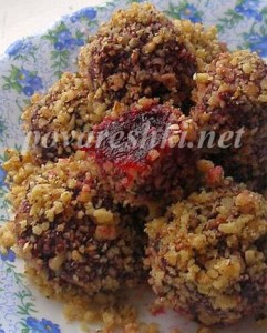 Влажными руками скатайте шарики-конфетки и обваляйте их в орехах.