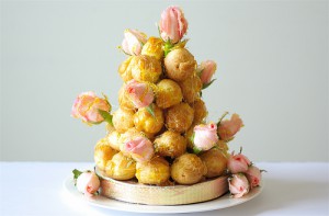 Утверждается, что крокембуш традиционо украшают засахаренным миндалем, вариантов украшений я в интернете видела много, но в данном случае решила использовать живые цветы.