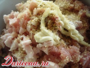 Мясо и сало порубить мелкими кубиками - примерно по 0,5 см. Добавить соль, перец, специи, раздавленный чеснок, воду и майонез. Тщательно вымесить фарш. Всыпать желатин и хорошенько перемешать. Положить в холодильник на 1 час.