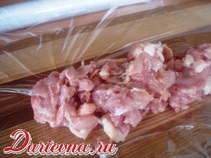 Выложить немного фарша на пищевую пленку.