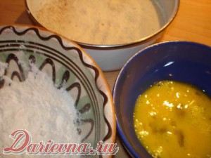 Яйца с помощью вилки взбалтываем, подготавливаем сухари, муку и нагреваем сковородку.