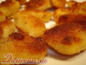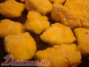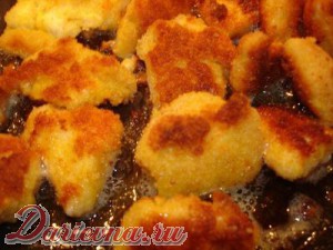 Кусочки филе поочередно обваливаем в муке, яйце и сухарях. (Если хотите панировку побольше, можно обвалять следующим образом: мука-яйца-сухари-яйца-сухари.) И отправляем быстренько на сковородку.