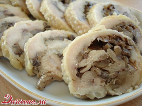 На окорочок выложить грибы с луком, чуть присолить, скрутить тугой рулет. Обвязать его ниткой (или заколоть зубочистками). Поверхность рулета смазать майонезом. Выложить швом вниз на противень, накрыть фольгой и запекать в разогретой до 180 градусов духовке 15-20 минут. Снять фольгу, допекать при температуре 200 град еще минут 10 – до появления румяной корочки.
