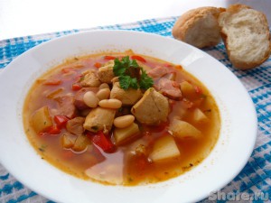 В основе этого супа - куриный бульон. Ну, а фасоль и подкопченные сардельки придают ему неповторимый аромат. Не совсем обычный способ приготовления делает мясо очень сочным и нежным, а вкус - насыщенным. Да выглядит такое первое блюдо очень аппетитно! Так что говорим спасибо кулинарному блогу Шате и спешим готовить!