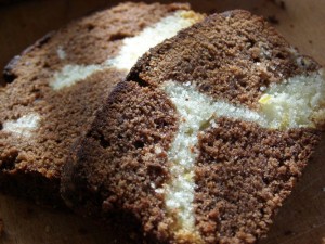 Выложить в форму послойно (или по одной ложке - белое тесто, коричневое, белое, коричневое). Выпекать при температуре 180 градусов около 50 минут.