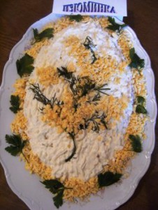 Украшение салата сделано из натертого желтка и замороженных укропа и петрушки (свежих под рукй не было).