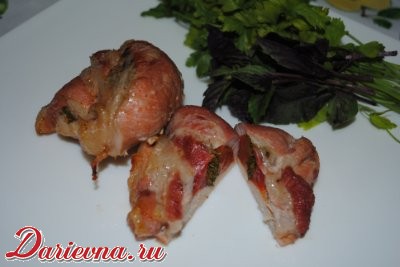 Духовку разогрейте до 190-200 градусов. Противень смажьте растительным маслом. Выложите мясные кармашки на противень и готовьте в духовом шкафу около 40 минут. Удалите шпажки и подавайте с овощным салатом.