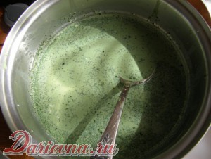 Молоко вскипятить, процедить, добавить зеленый чай и сахар, довести до кипения, но не кипятить. Накрыть крышкой и дать постоять.
