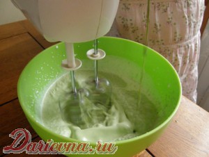 Взбить сливки. Влить молочную смесь, перемешать, залить в емкость и заморозить (у меня мороженое стояло ночь).