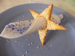 Держатели для салфеток тоже могут быть съедобными. В виде аккуратных звездочек, они придадут столу новогоднюю атмосферу. Мясная закуска "Дед Мороз" говорит сама за себя. Състь такого милого Деда Мороза не откажется ни взрослый, ни ребенок! Сладкая елочка - очень символично, не правда ли? Снежинки из безе будут очень похожи на настоящие. А гвоздем программы станет торт-снеговик - уверена, гости ахнут, когда увидят это чудо!