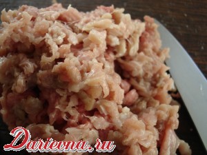 Яйцо слегка взбить. Смешать мясо и лук, добавить яйцо, майонез, соль и перец. Тщательно вымесить фарш.