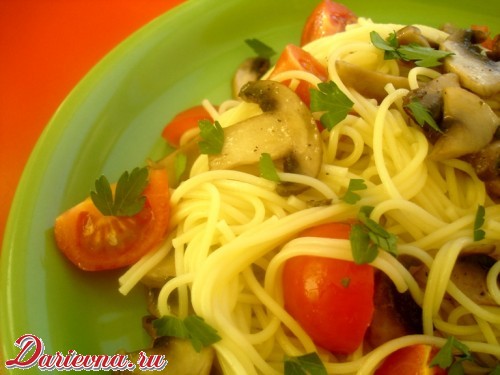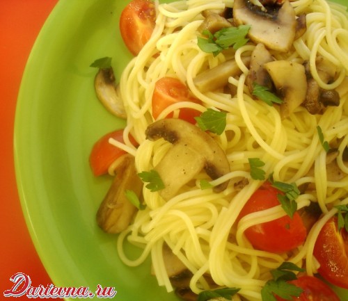 Чеснок нарезаем очень мелко. Грибы нарезаем кубиками или пластинками, на ваш вкус. На разогретую сковороду наливаем растительное масло, выкладываем чеснок, обжариваем пару минут, затем добавляем грибы, обжариваем 5-10 минут, солим перчим по вкусу. Тем временем отвариваем до готовности пасту. Помидорки нарезаем на четвертинки. Выкладываем в глубокую тарелку пасту, затем грибы с чесноком, затем помидорки. Перемешиваем. Выкладываем на тарелку, посыпаем рубленной зеленью.